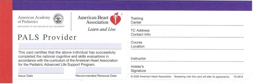 本會提供標準14小時的PALS教學課程,由合格之PALS指導員授課,通過筆試及術科測驗者獲發美國心臟學會兒科生命支援術證書,有效期為兩年。